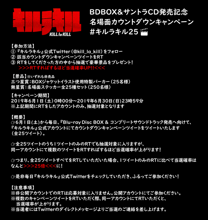 『キルラキル』Blu-ray Disc BOX及びコンプリートサウンドトラックの発売を記念して、公式Twitter(@kill_la_kill)にて、6月1日(土)よりスペシャルキャンペーンがスタート!